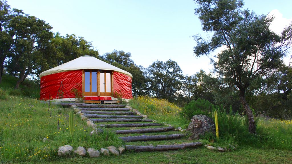 Tras cuatro años en la Sierra de Huelva, emprendimos un proyecto de ecoturismo que nos permitió ofrecer actividades presenciales. Nos trasladamos a San Vicente de Alcántara (Badajoz), a una finca que bautizamos como Kalki. Allí construimos una yurta de 50 m², que durante tres años fue el espacio para clases, talleres, terapias y formaciones. En este entorno, profundizamos en conocimientos sobre naturaleza, permacultura, vida rural y sostenibilidad. Además, compartimos experiencias como celebraciones estacionales, baños de bosque, georutas, meditaciones activas y jornadas de convivencia, fortaleciendo la conexión con la comunidad y el entorno